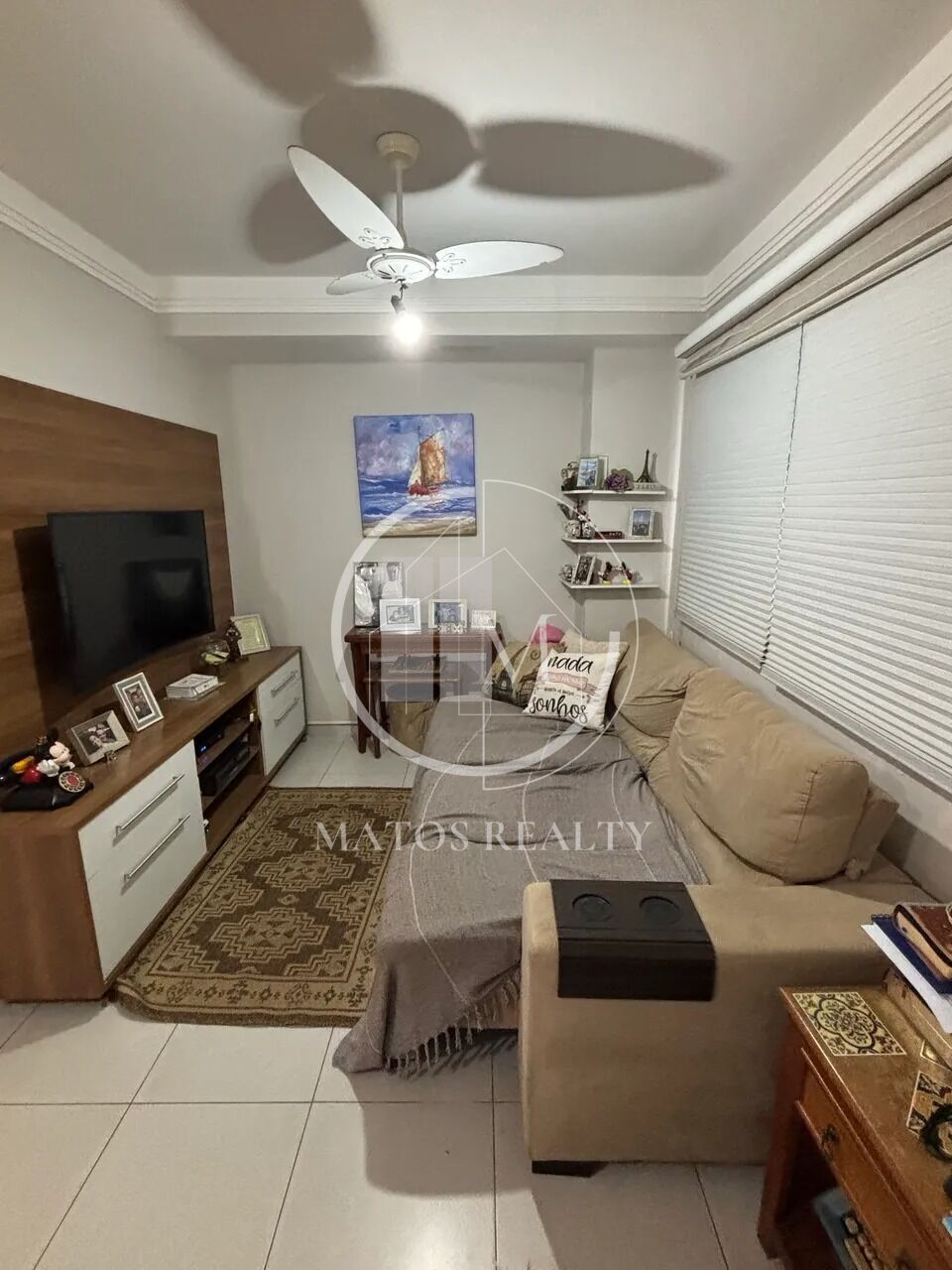 - Sala de TV aconchegante com ventilador de teto